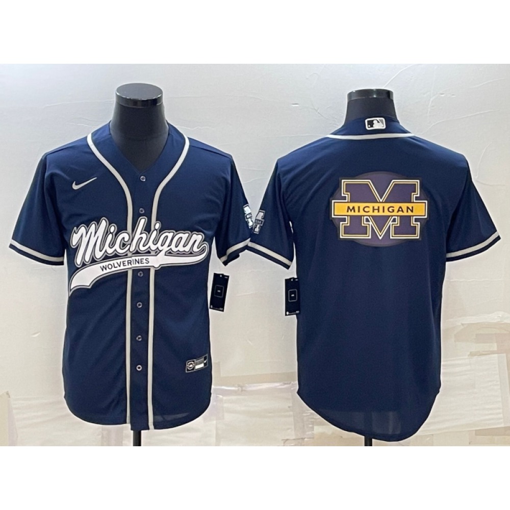 Men's Michigan Wolverines Navy Team Big Logo With Patch Cool Base Stitched Baseball Jersey